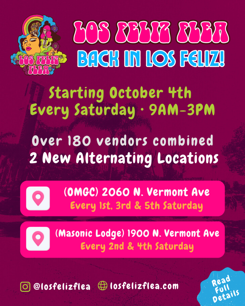 We’re excited to officially announce that the Los Feliz Flea is coming back to Los Feliz! Beginning October 4th, the Los Feliz Flea returns—now with two locations alternating each saturdays of the month from 9am to 3pm, featuring a combined total of over 180 vendors both on Vermont walking distance from each other.