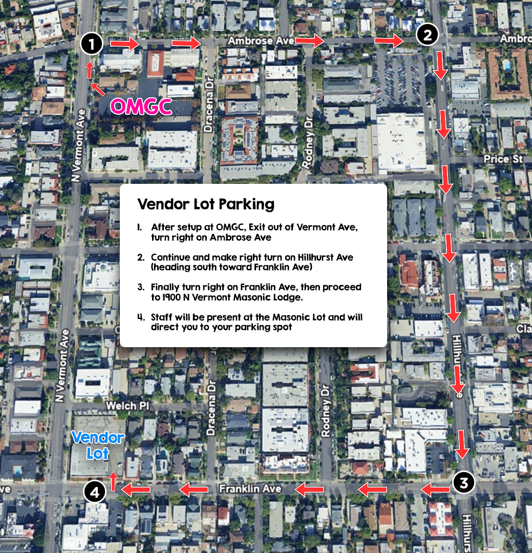 After your setup at OMGC, exit the lot by making a right turn onto Vermont Ave only.