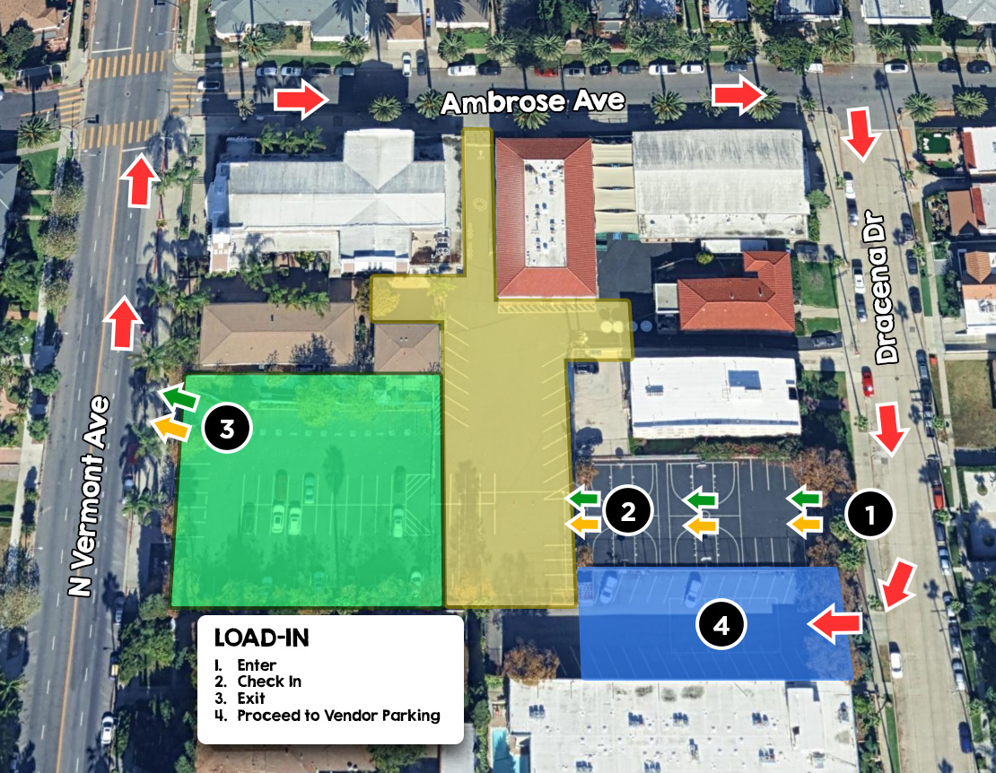 After unloading, immediately drive off the lot via the Vermont exit then to Vendor Parking